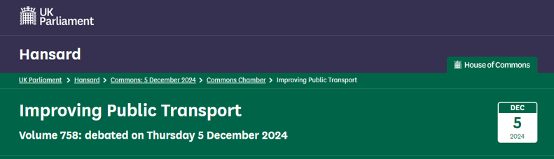 The full Hansard record of Sarah Dyke MP on 5th December can be seen here: https://hansard.parliament.uk/Commons/2024-12-05/debates/0AFA0327-EA7E-4F4B-B3FF-029194681CD8/ImprovingPublicTransport#contribution-2AEA08E4-05B3-4260-9519-C8136771BB58