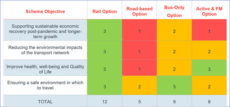 The rail alternative scores highest as it is best aligned with the scheme objectives due to its ability to provide a strong alternative to the car, delivering the greatest increase to accessibility and providing the safest method of inter-urban travel, as well as encouraging mode shift and improving the environment through reduced road traffic carbon emissions.