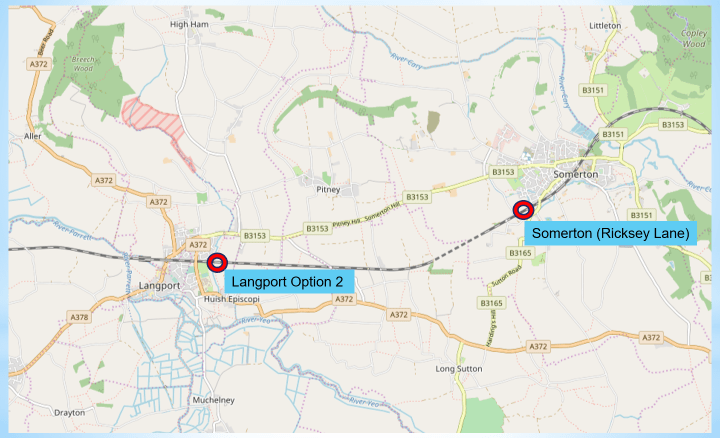 - Langport. A site to the east of Option 1, near the current pedestrian railway crossing (Langport Option 2);